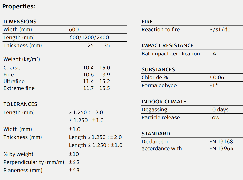 The table below indicates the tolerances declared by us in accordance with EN 13168, the standard for cement-bonded wood wool and double-layer panels with cement-bonded wood wool, and EN 13964, the standard for suspended ceilings.